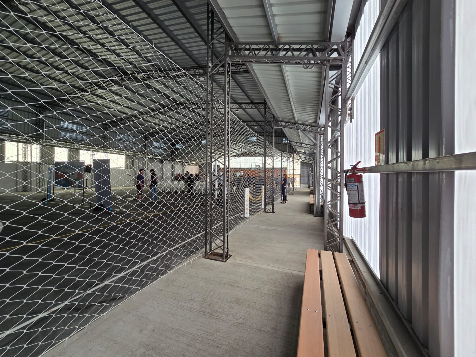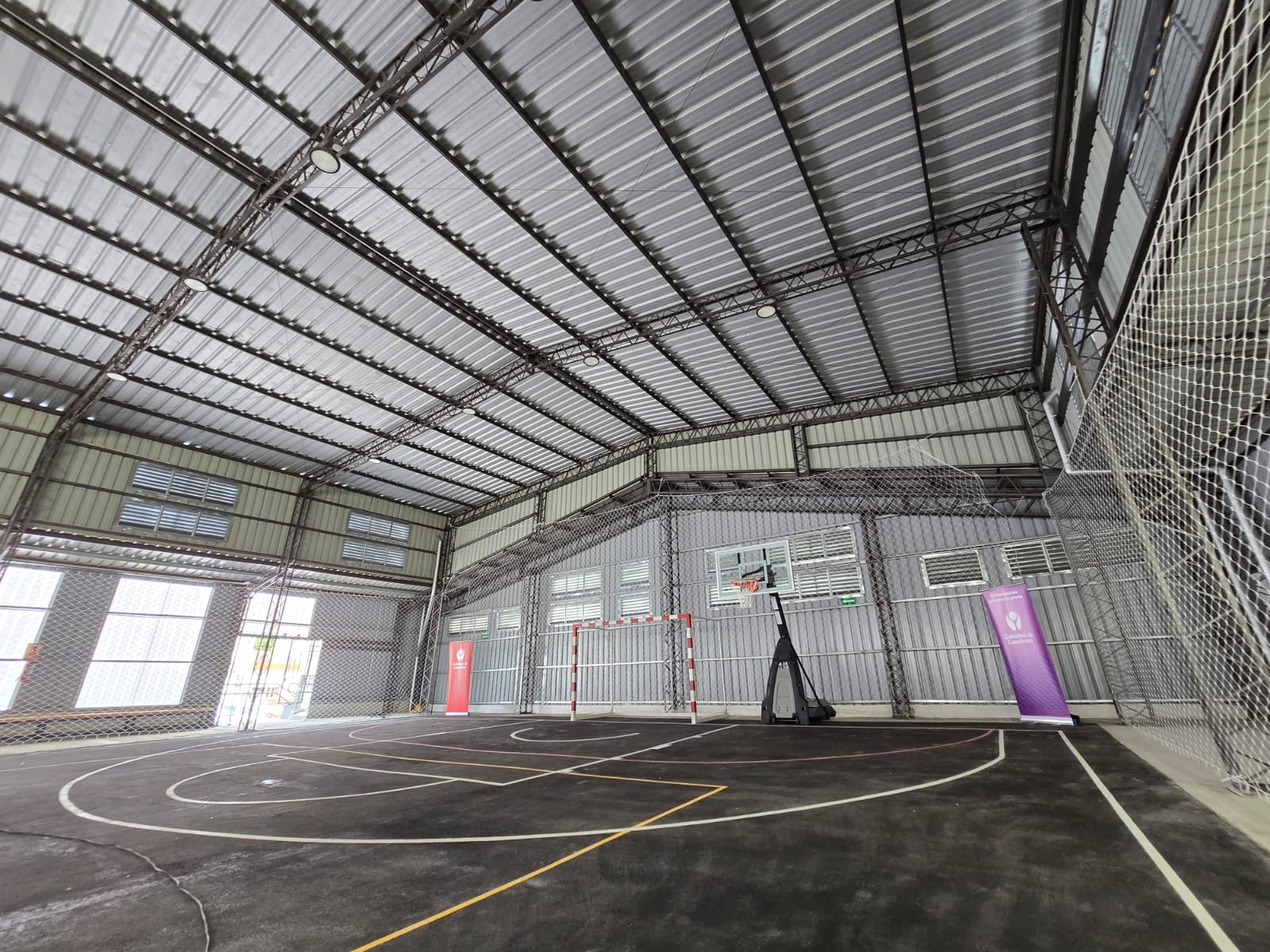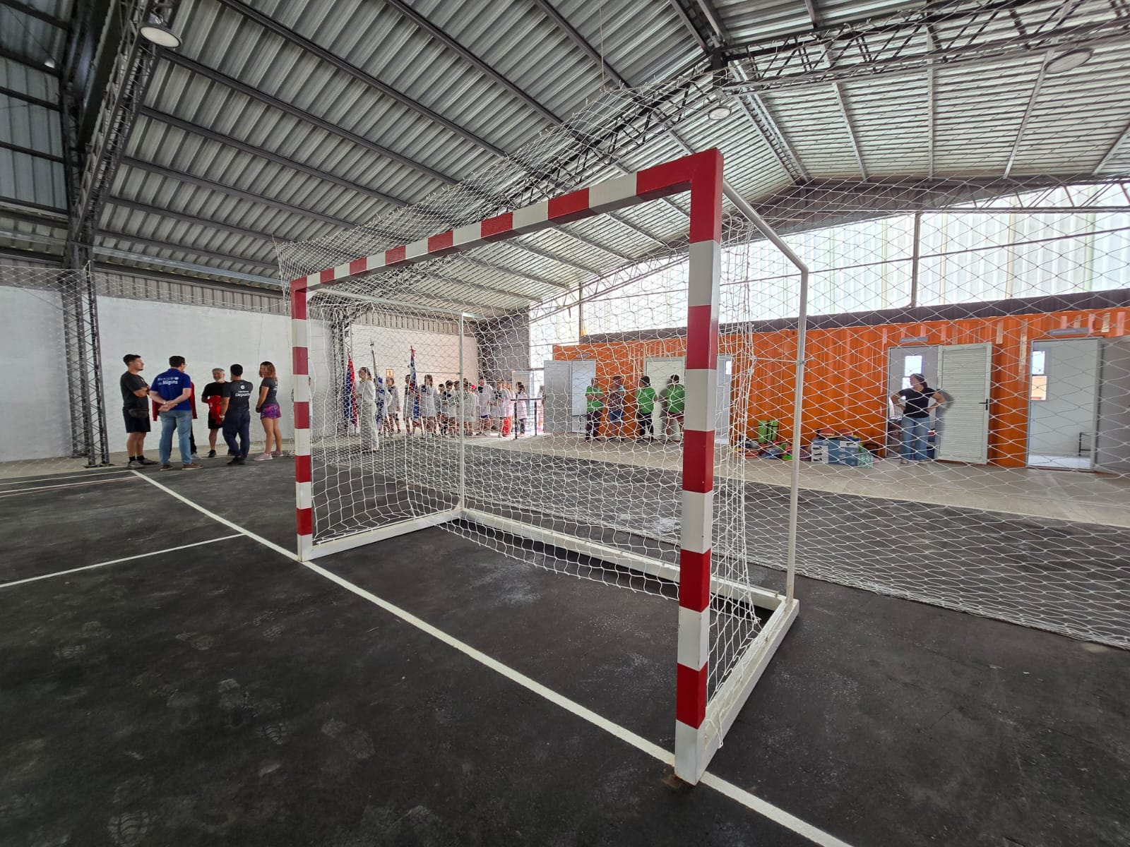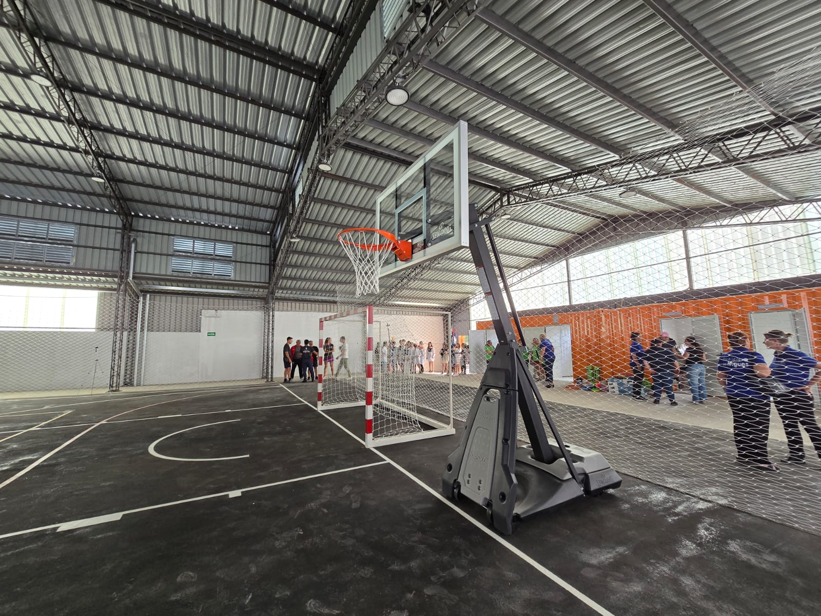 Los trabajos implicaron, además, la construcción de nuevos pavimentos y la reforma de los contenedores existentes conformando dos vestuarios, depósito y servicios higiénicos (uno de ellos accesible). A su vez, se dotó al edificio de cartelería interior y exterior –en concordancia con la estética de los restantes polideportivos del departamento–, se realizó la demarcación de la cancha, se instaló equipamiento deportivo (arcos, red y tableros móviles) y se construyeron asientos perimetrales para el público.