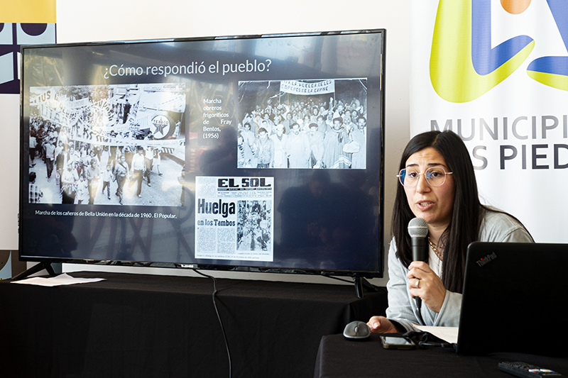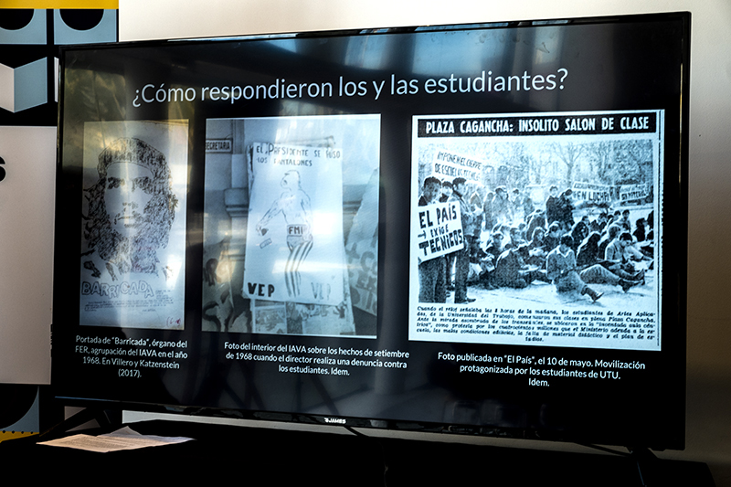 La profesora González hizo un recorrido por las noticias referentes a las luchas estudiantiles de los años sesenta y setenta en Uruguay, analizando diferentes portadas de cotidianos de la época como Marcha y El País. Explicó la situación socioeconómica y educativa de esa época e indicó que en aquellos años aumentó de forma exponencial la matrícula estudiantil, no así el presupuesto. A su vez, presentó varias diapositivas con fotos y gráficos económicos y le dedicó especial atención a la lucha estudiantil por el boleto.