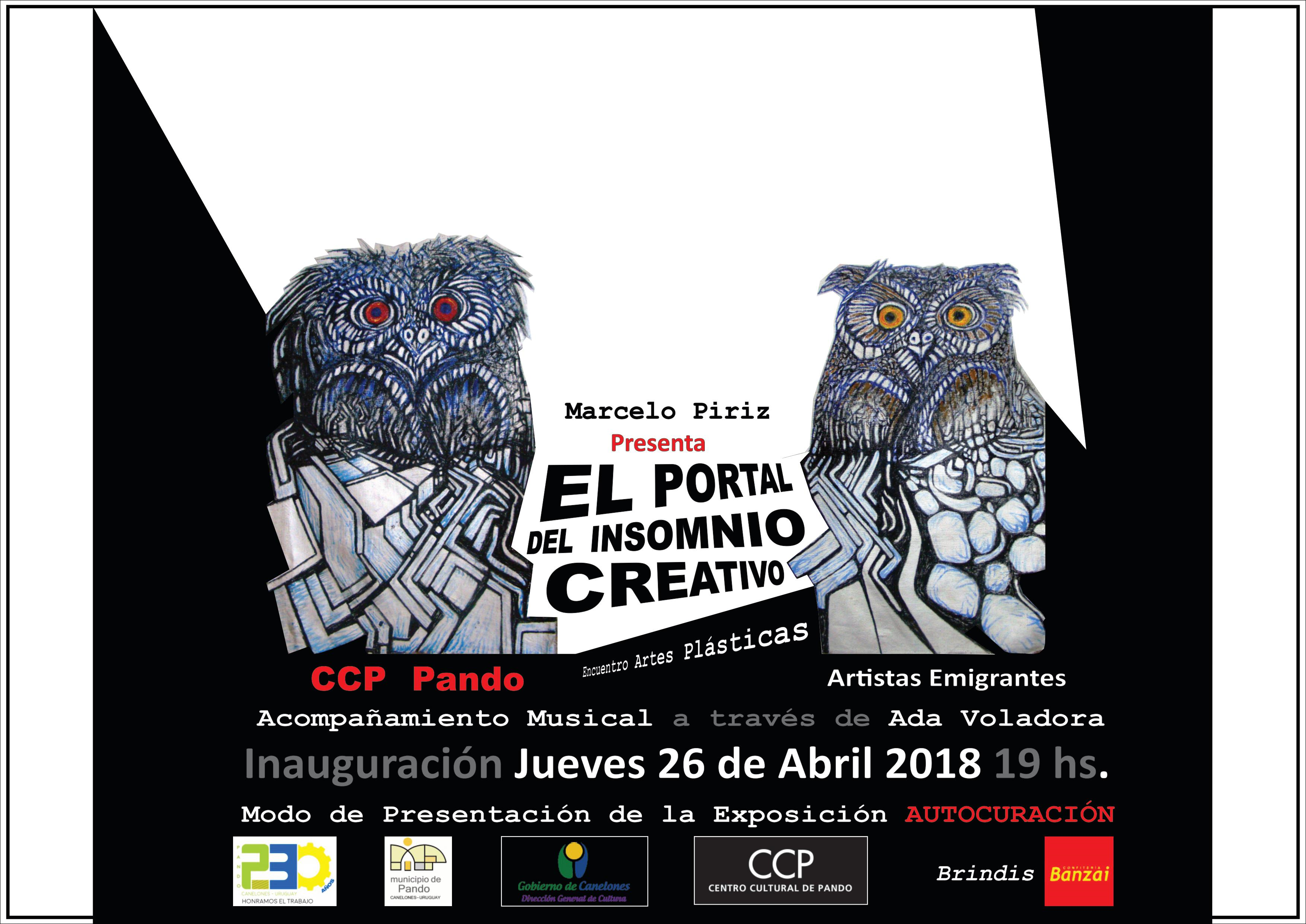 Marcelo Piriz presenta "El Portal del Insomnio creativo" en Pando, el cual se inaugurará el jueves 26 de abril a las 19 horas en el Centro Cultural de Pando. El acompañamiento musical estará a cargo de Ada Voladora.