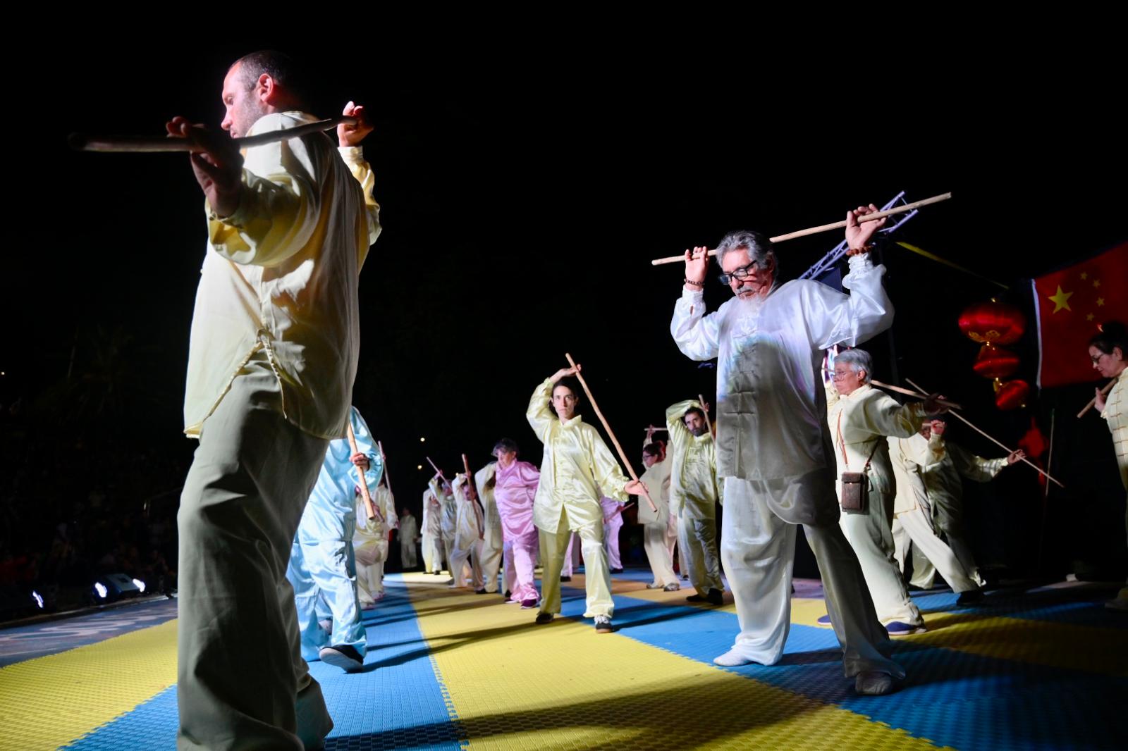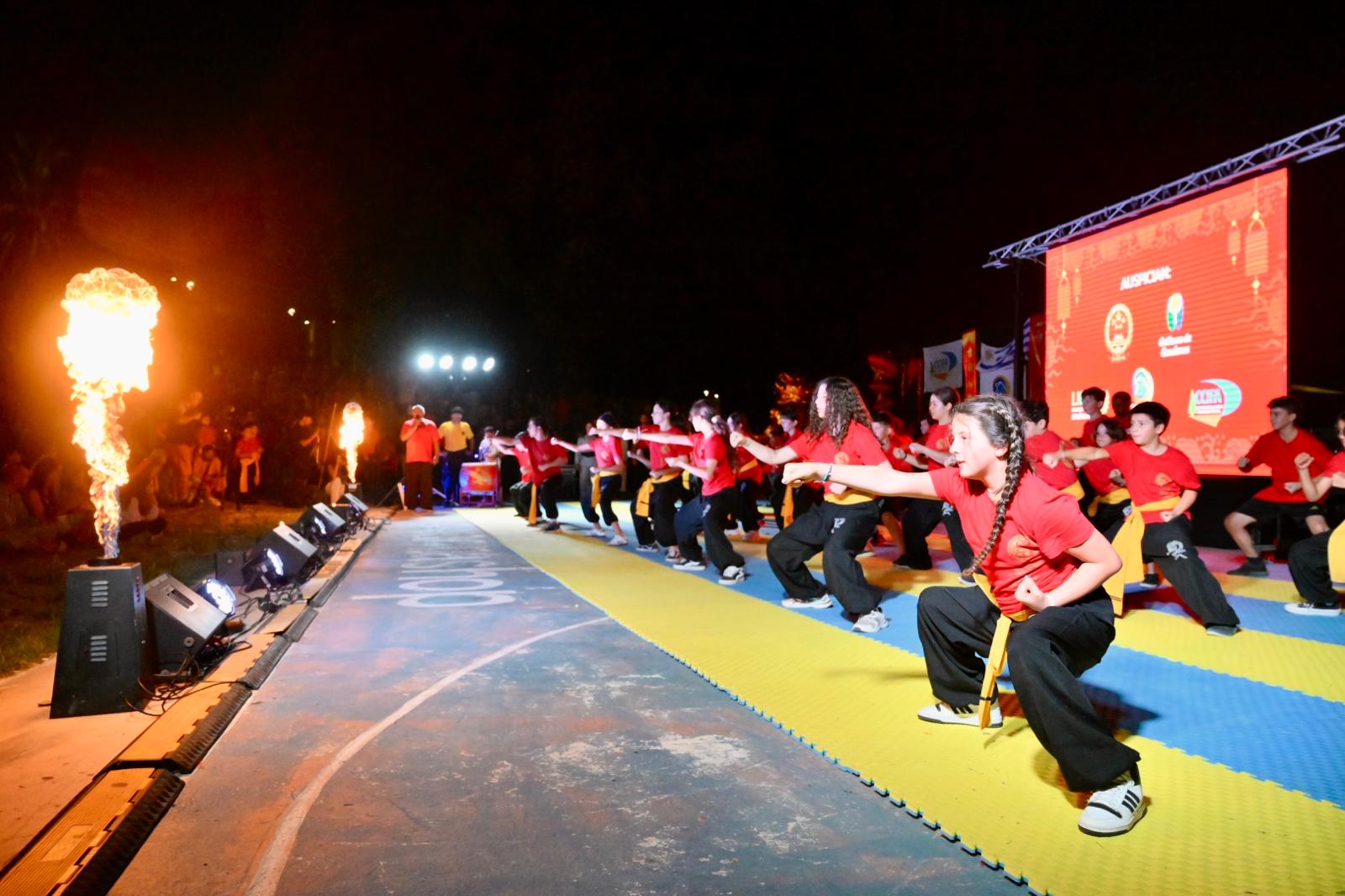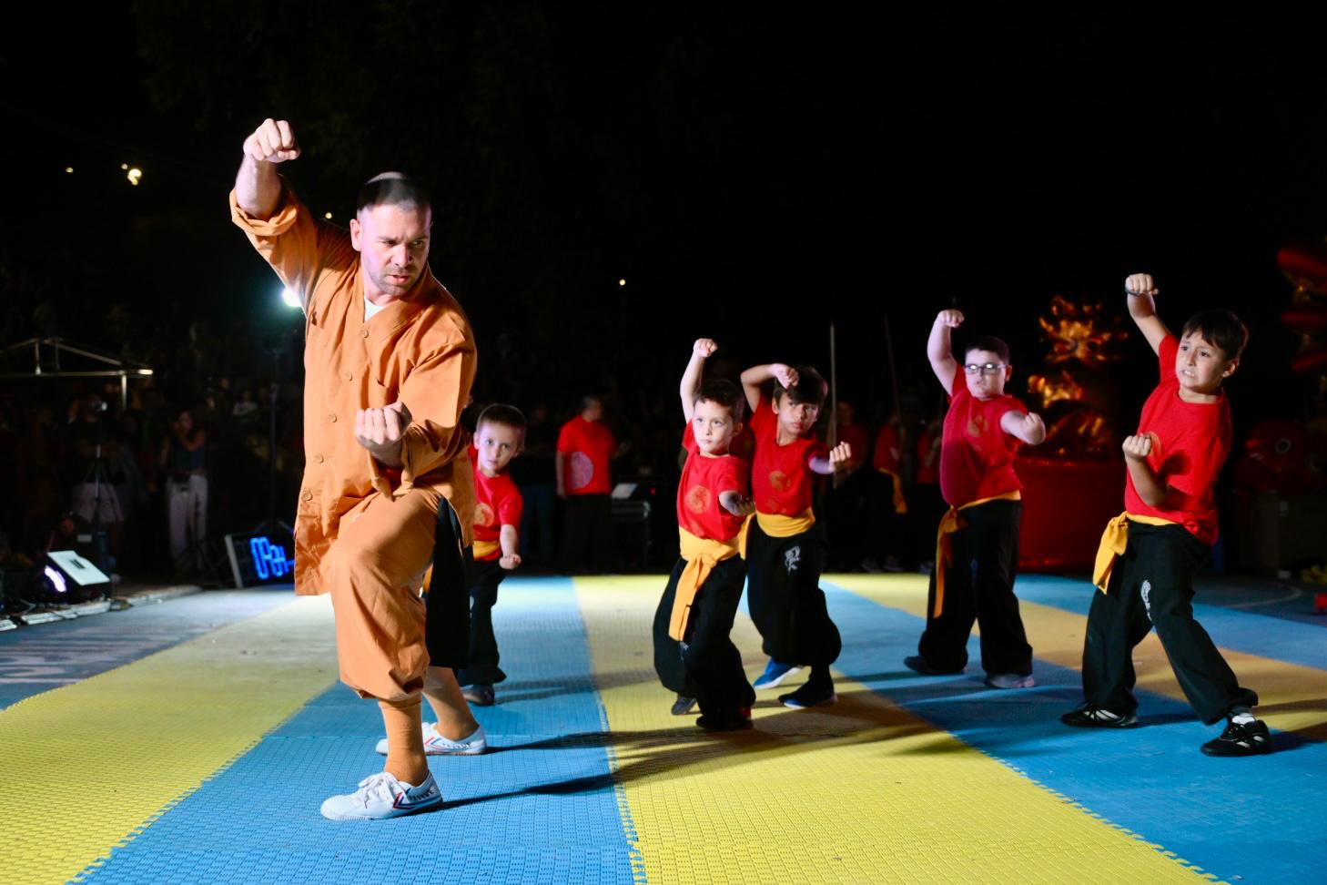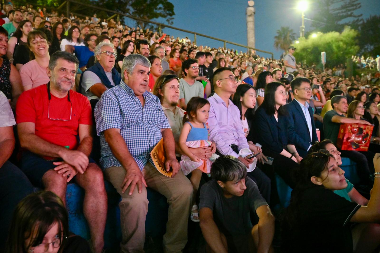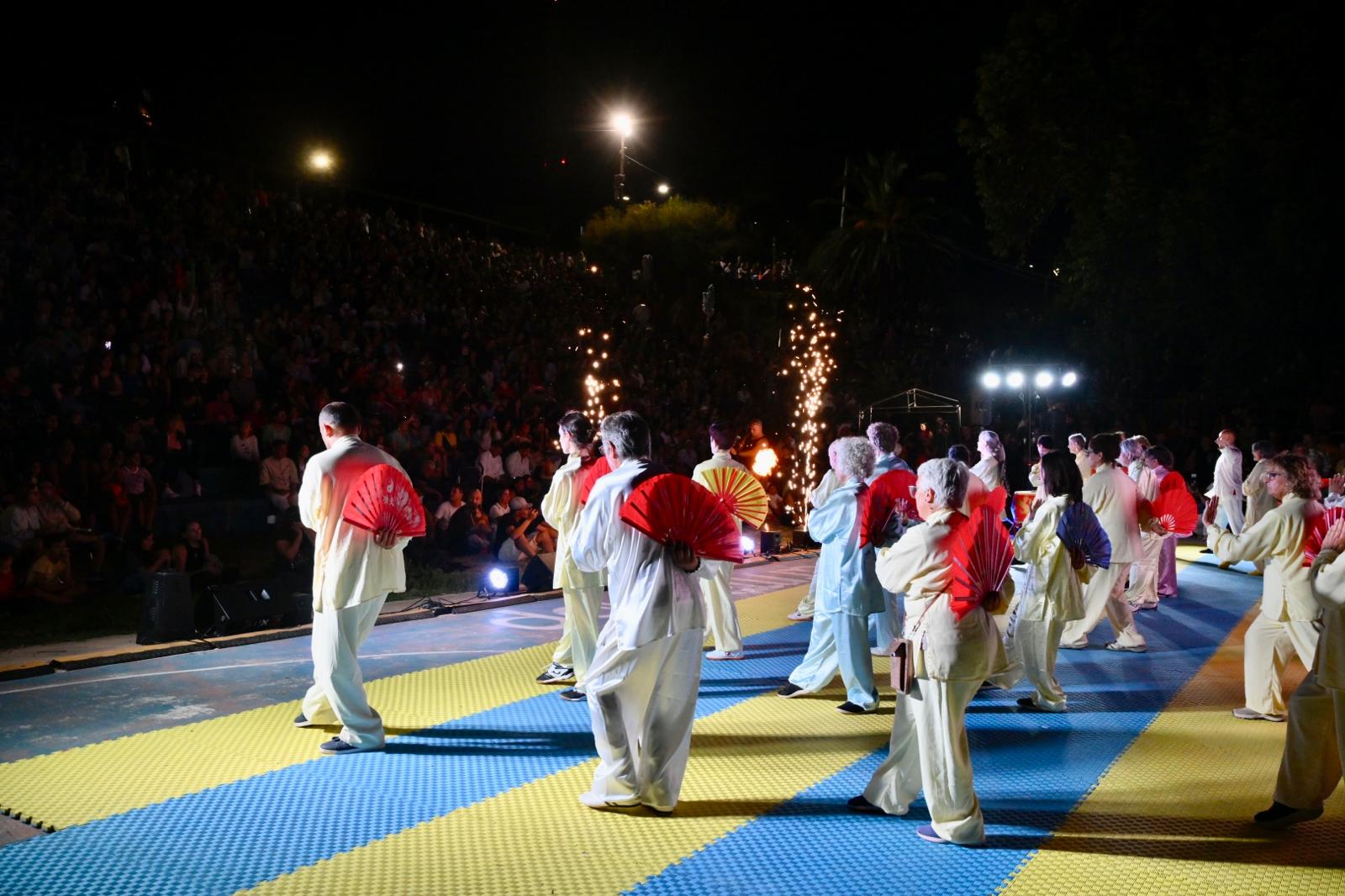 Finalizado el recorrido, el público se trasladó hacia la rambla, donde la expoplatea José Carbajal volvió a mostrarse colmada. Allí tuvo lugar el acto central de la jornada, que incluyó exhibiciones de artes marciales y distintas expresiones tradicionales de la cultura china, en un marco especialmente preparado para la ocasión.