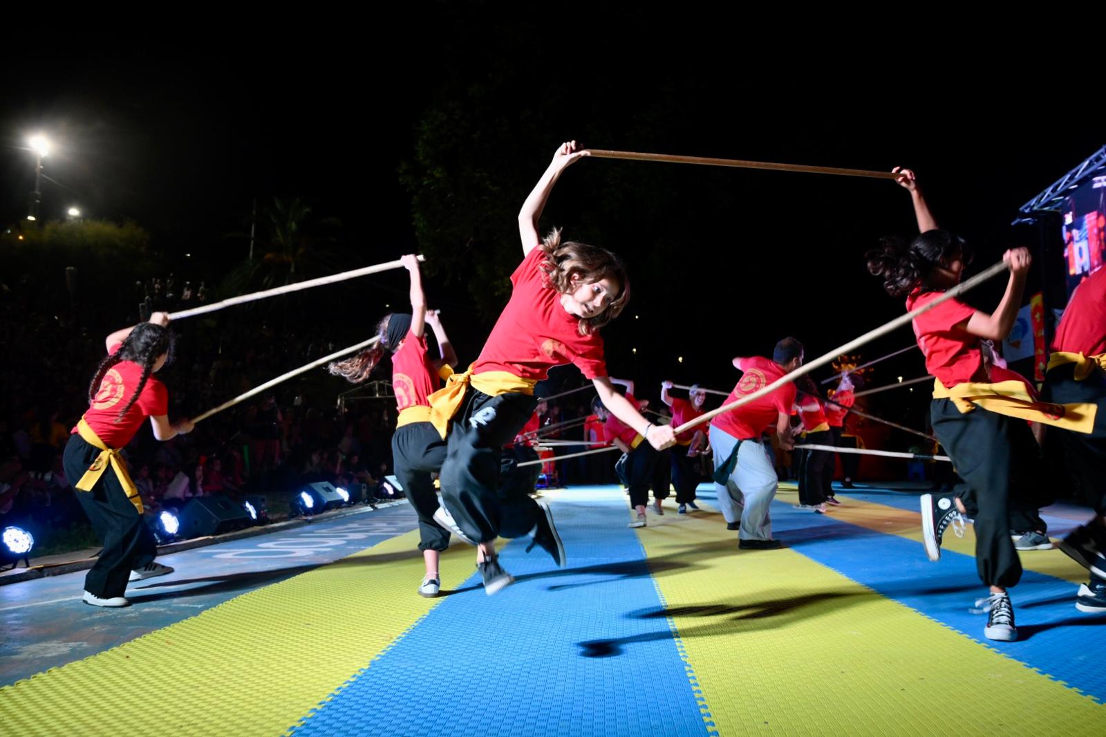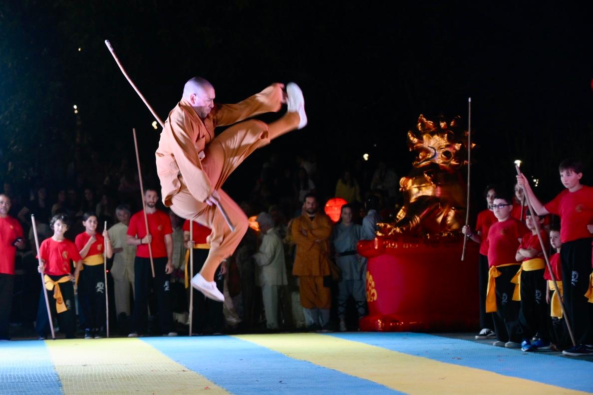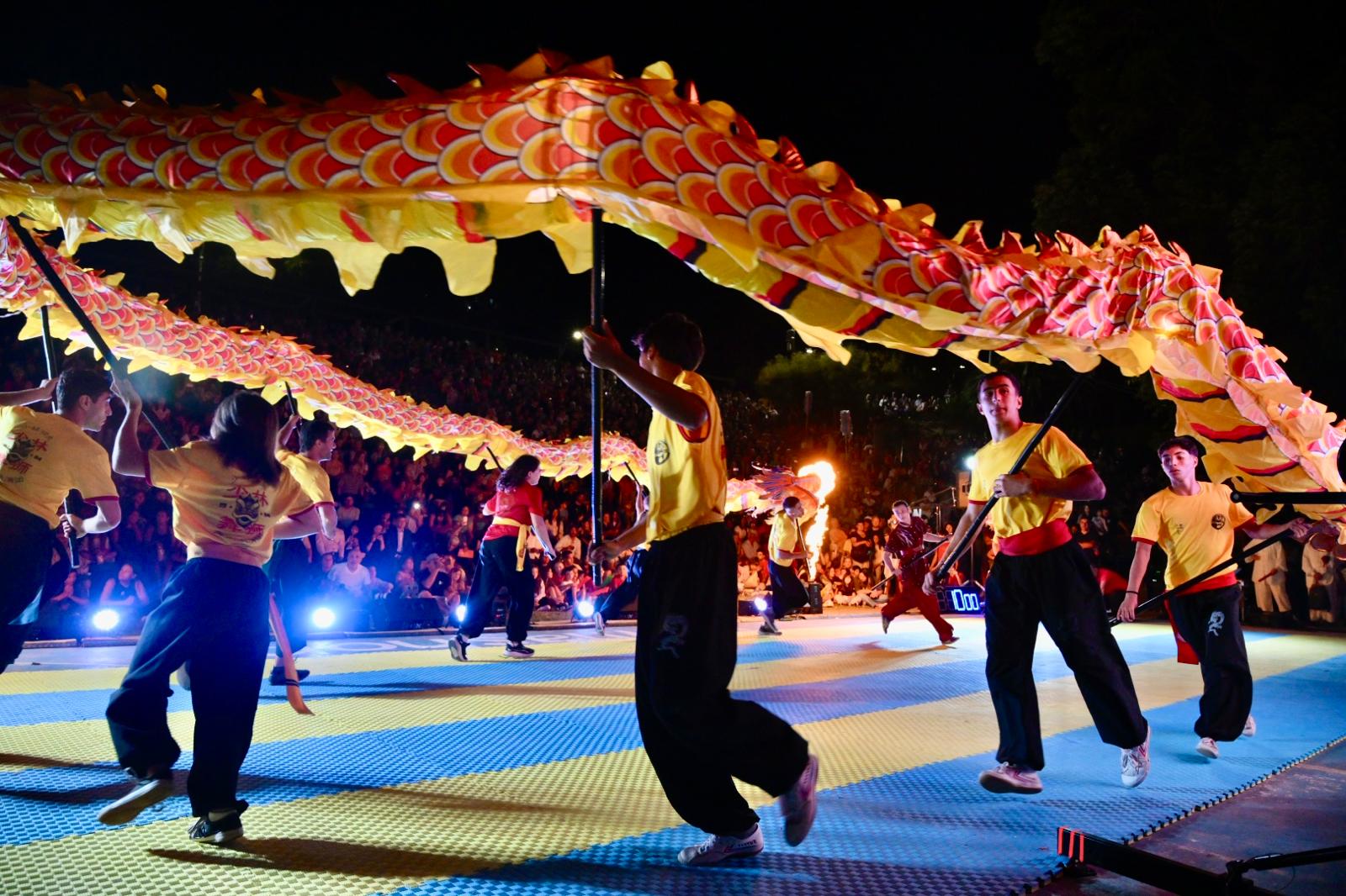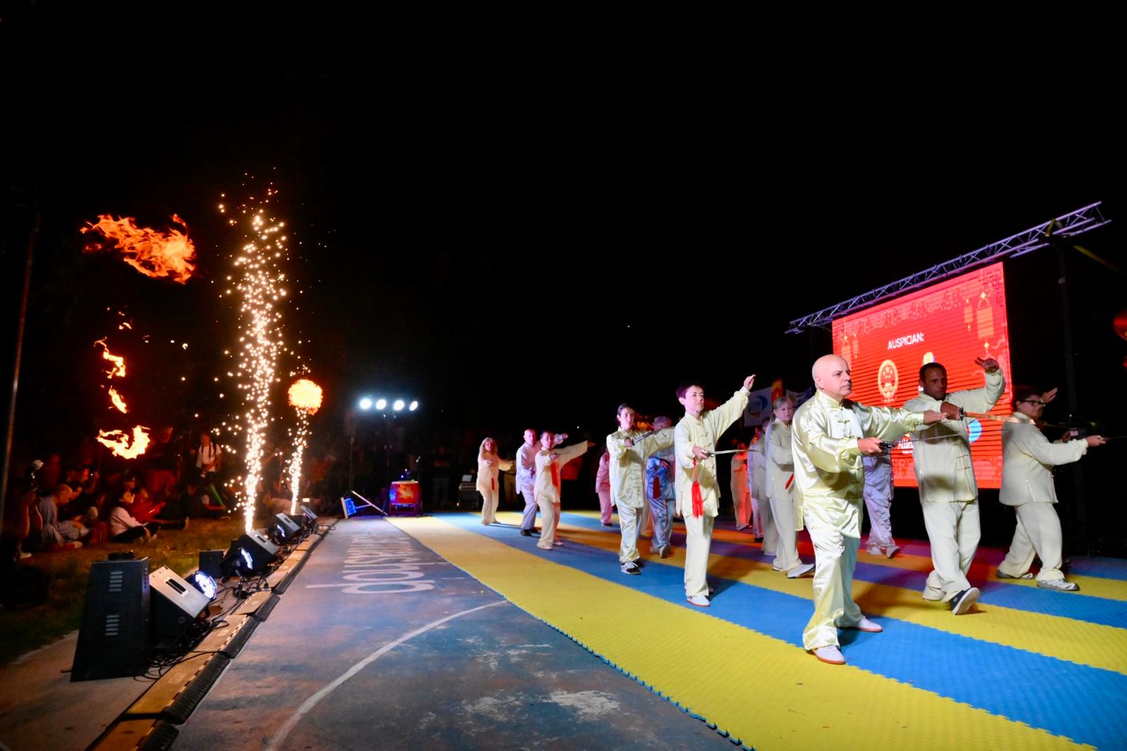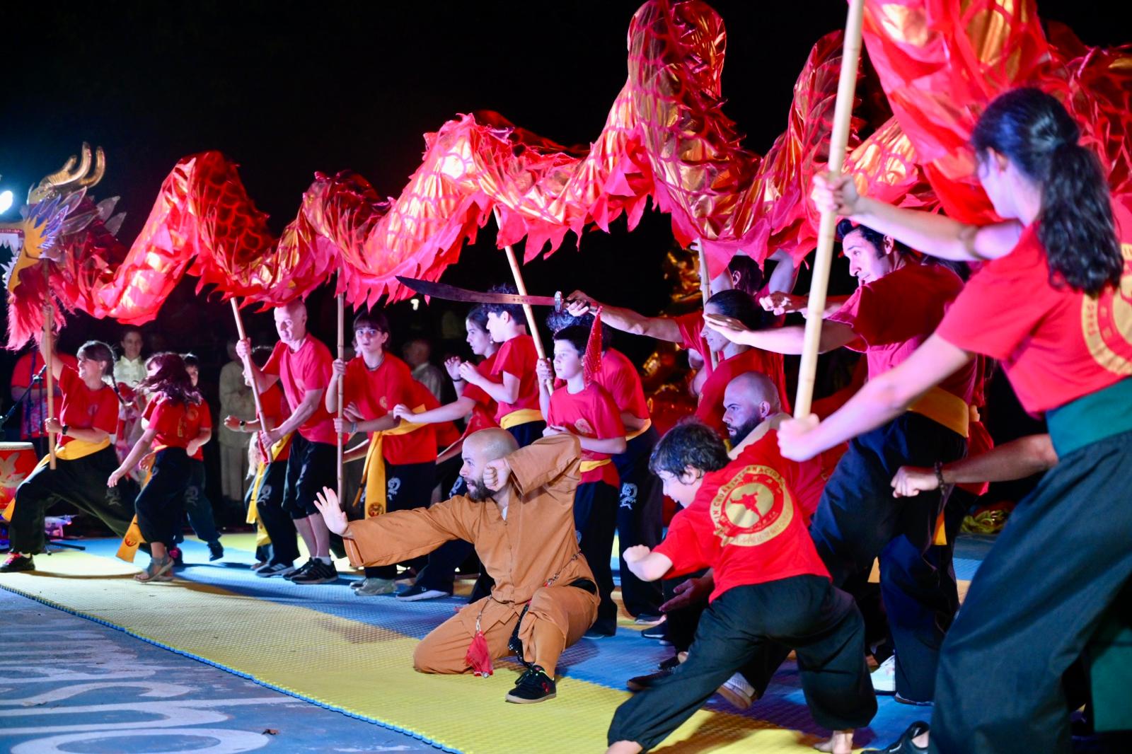 Finalizado el recorrido, el público se trasladó hacia la rambla, donde la expoplatea José Carbajal volvió a mostrarse colmada. Allí tuvo lugar el acto central de la jornada, que incluyó exhibiciones de artes marciales y distintas expresiones tradicionales de la cultura china, en un marco especialmente preparado para la ocasión.